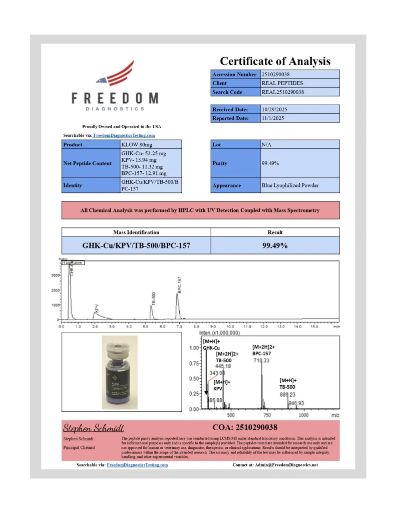 Choose KLOW when you need a comprehensive, time-saving solution for advanced tissue-repair and regenerative studies. Rather than managing four separate peptides, KLOW’s pre-mixed formulation ensures consistent ratios, simplifies dosing, and speeds up assay setup—so you can focus on results, not logistics.