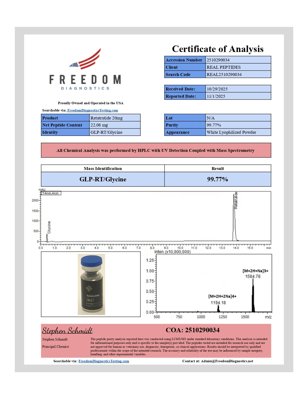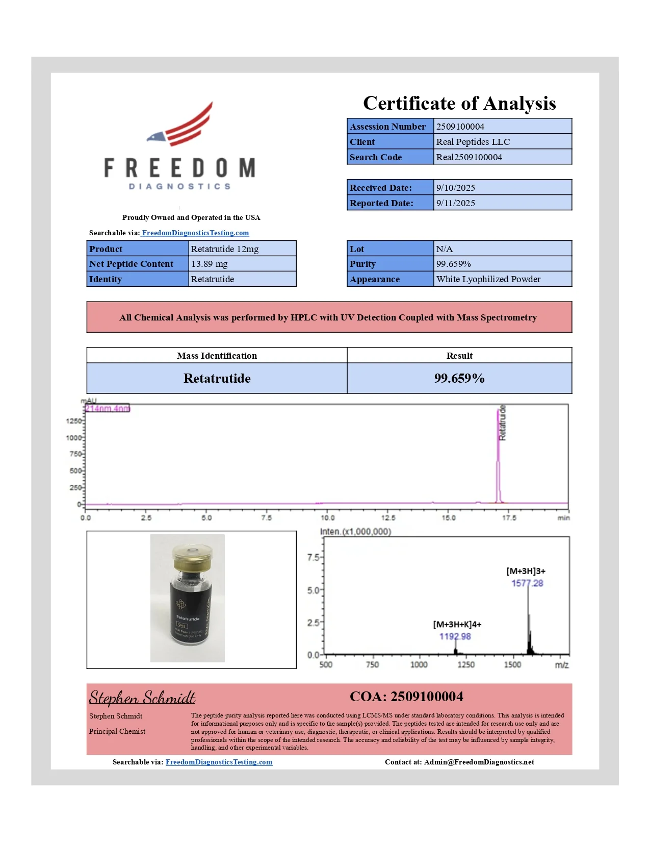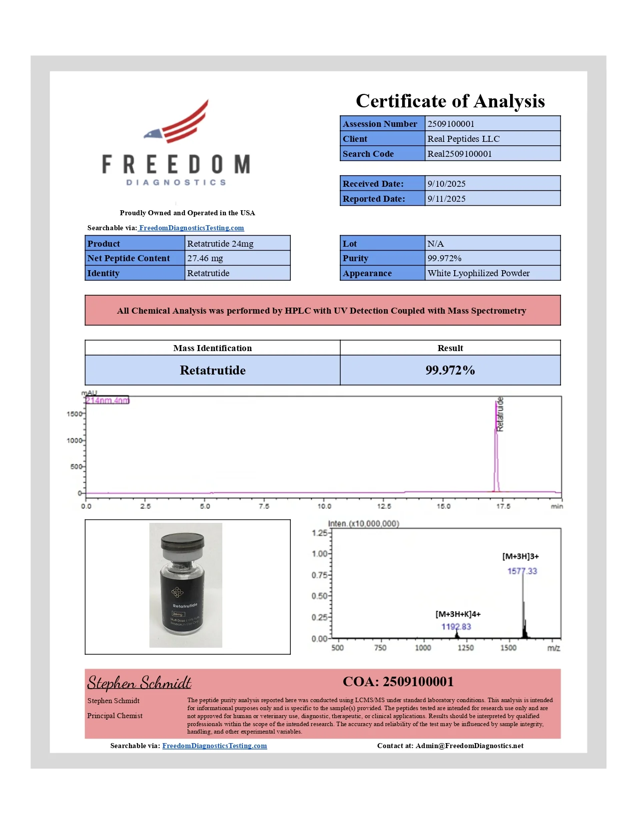 Our Retatrutide is USA-manufactured under cGMP-like conditions, with each batch lab-tested for purity, potency, and consistency. Certificates of Analysis (COA) are provided for all research peptides.