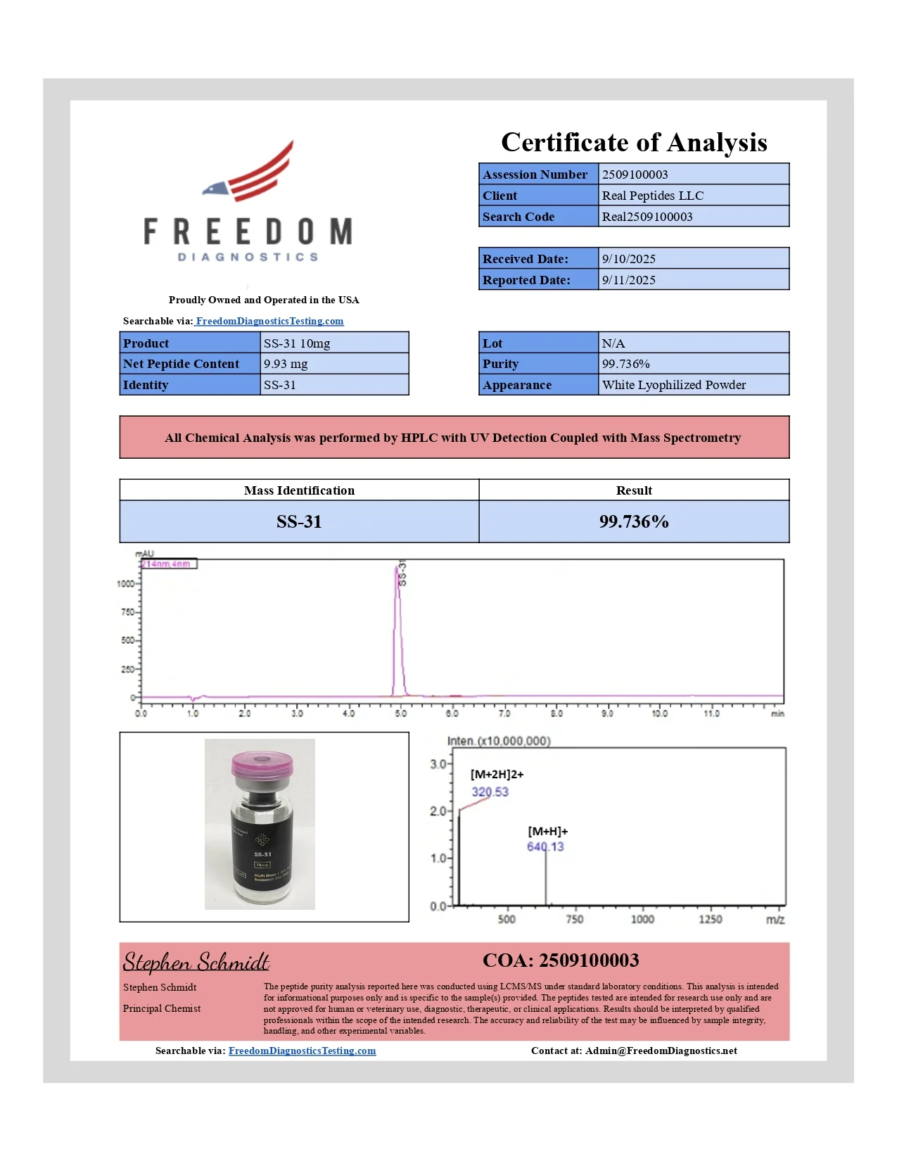 SS-31 (Elamipretide) is a synthetic tetrapeptide engineered to target the inner mitochondrial membrane and scavenge reactive oxygen species. Widely used in cell and tissue models, SS-31 supports studies of mitochondrial bioenergetics, oxidative-stress mitigation, and cell survival signaling. Each lot is produced under ISO-certified conditions, confirmed ≥99% purity by HPLC, screened for endotoxin (<0.1 EU/mg), and shipped with a full Certificate of Analysis.
