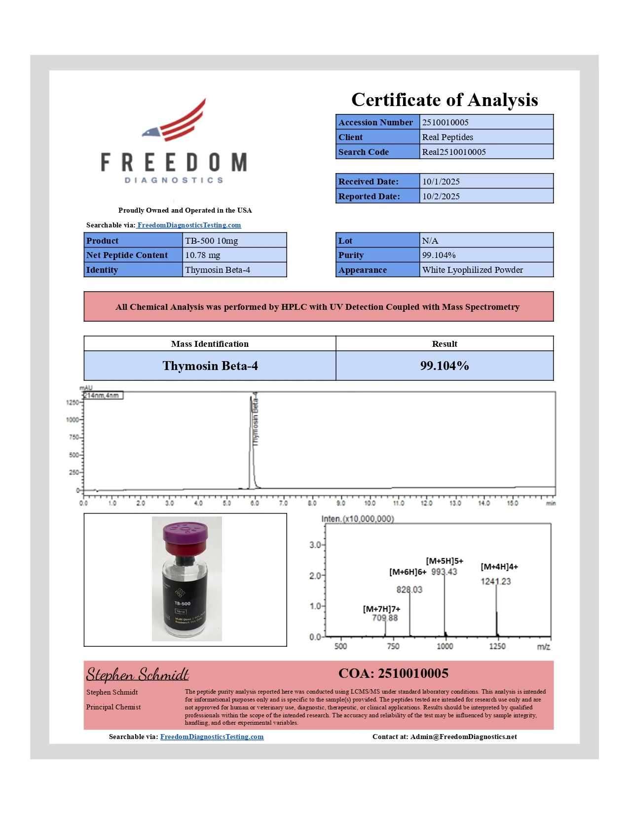 99% Pure | USA Made | Multi DoseTB-500 (Thymosin Beta-4) is a synthetic 43-amino-acid peptide fragment used in preclinical models to explore tissue repair, cell migration, and inflammation resolution. In cell-culture wound-closure assays and rodent injury models, TB-500 accelerates fibroblast migration, modulates cytokine profiles, and supports angiogenic signaling. Each 10 mg vial is USA-manufactured, HPLC-verified to ≥ 99% purity, endotoxin-screened (< 0.1 EU/mg), and formulated for laboratory research.